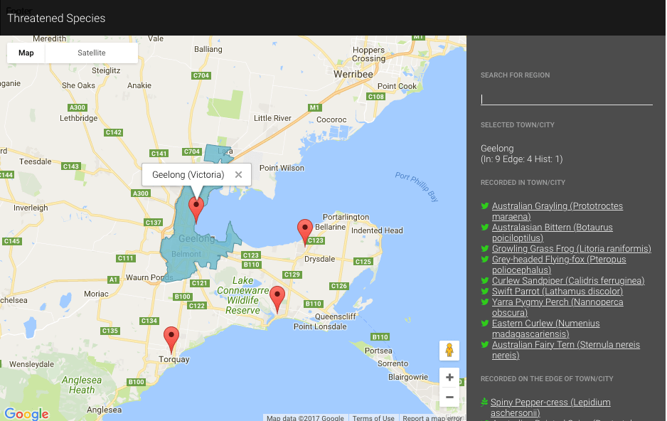 You can use the search bar to look up your home town, or just explore by clicking on the markers for each city. For every location, it will bring up a list of all the threatened species that: